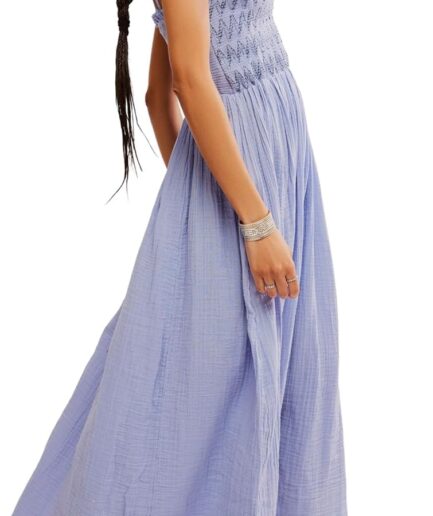 • Women 2025 Boho Long Sleeve Square Neck Smocked High Waist Flowy A Line Lace Trim Maxi Dress